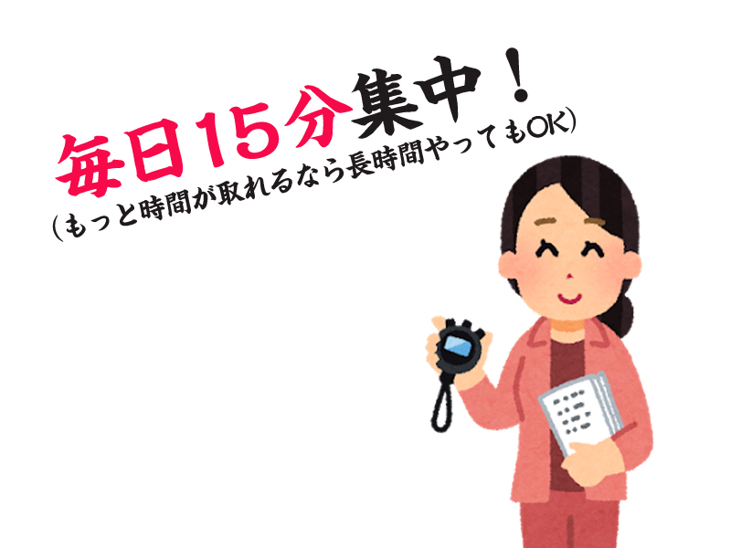 学習時間は無理して作らず、1日15分程度を確保すればOKです。